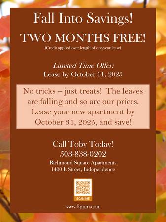 **Limited Time Offer** TWO MONTHS FREE RENT over the course of one year!**Select Units Only!**Must rent by October 31, 2025!**
