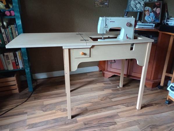 The table appears to be custom and folds out for larger projects and better storage. The sewing machine tucks up underneath so you don't have to worry about moving it out of the way.