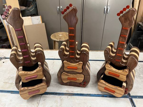 I have two left of these keepsake boxes that are shaped like a Guitar. Made of Black Walnut with Zebra wood drawers and Purple Hart knobs.