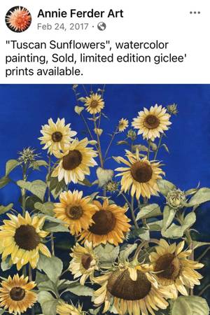 This is a gorgeous limited edition giclee’ print of the 2017 watercolor painting called “Tuscan Sunflowers”, signed & numbered by the artist, edition #3/50