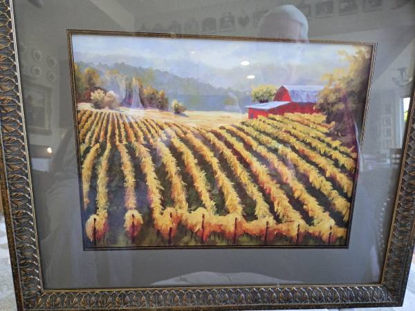 Beautifuly double framed art. Scene of barn and vineyards.
