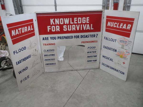 Warehouse find! Cold war vintage information board. Appears all hand lettered and painted. Very good condition for it's age. Center portion is 48" x 48" plus two wings. Great backdrop for your...