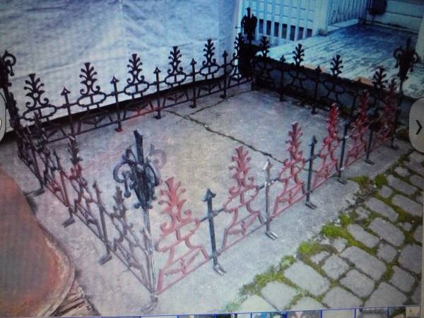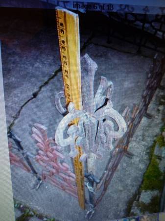 A crown for your antique home! Or a fence around an antique grave plot! This iron cresting was originally made in a rectangular shape and my photographs show it as being 86" x 62" but each iron section can be unscrewed to become 14" in length and your own dimensions can be adjusted for. There are 20 sections and 4 corner posts. Each section has a footing piece and the foot juts out 2.5". In each section, the shorter "arrow" design stands at 18" in height and the "Asian-inspired" design with a phoenix on the bottom area stands at 23" high. Each corner post is 32" in height. The iron is very substantial and there is no loss of material due to erosion, rusting, or weathering. There are no missing pieces and some welding repair work is present in 3 sections and in 2 corner post decorations near the top. After this piece is painted and securely installed, the repaired sections will not be noticeable. Wrought iron is heavy and would be difficult to ship without damaging this complete, hard-to-find architectural piece, therefore, the buyer will be responsible for pick-up and transport. Cash or PayPal only!