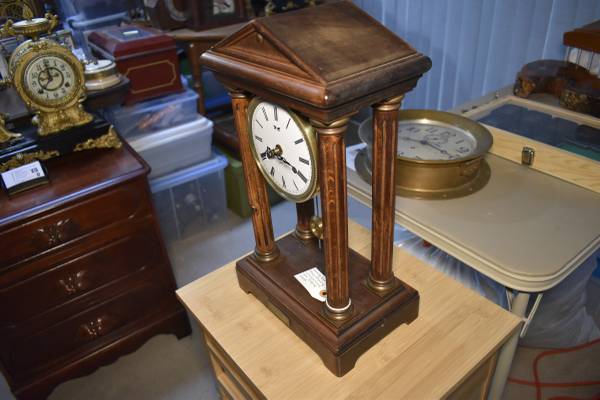 Item#: 2098 Hermle German empire column wood 1901 plaque clock.Tested/repaired/detailed by a professional-horology clock repairer. This clock is in excellent working condition and has a ninety day warranty. Warranty does not cover damage or missing parts. Antique clocks are a piece of art they were manufactured by unique outstanding old world craftsmen. You will receive an invoice for your purchase. I sell unique interesting top quality items only. Jewelry/watches/clocks collectables. One-stop shopping look at multiple items at your convince. Why waste your time and gas money looking at individual items for sale. Any questions you may have always welcome. When emailing about item please indicate the “ITEM NUMBER” I have more than two thousand items for-sale. Email me or call me direct for best results. Appointments available even after business hours and on Sunday’s. Cash sales only.