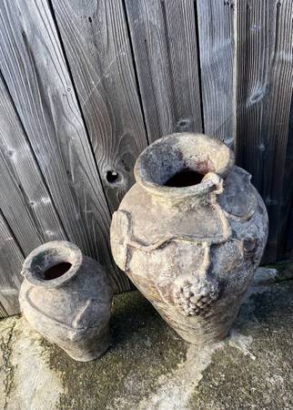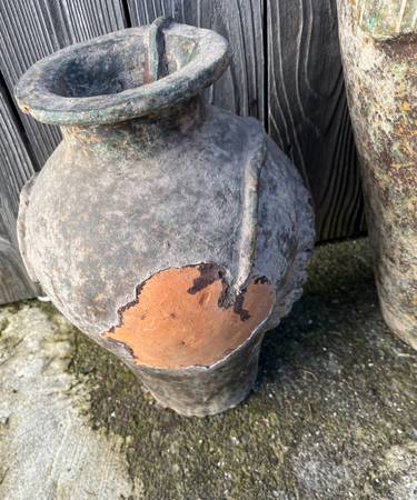 TWO VINTAGE CLAY OR TERRACOTTA POTS 1- 22” 1- 15” 1 HAS DAMAGE BOTH FOR $100 LOCAL SALES