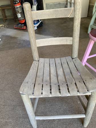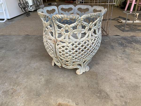 Various items, fruit crates $5 each, child's chair $15, table top $10, (I have a bottom but have to add photo), iron planter pot $35, hanging basket pot $20