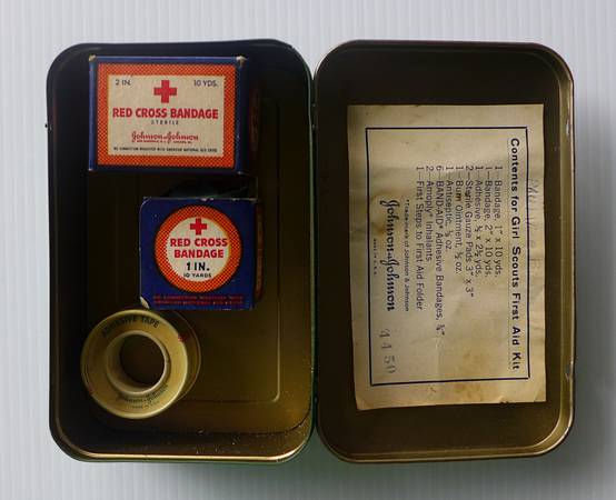 Vintage Girl Scouts Official First Aid Kit tin, Johnson & Johnson, with contents. Contains some of the original contents, as pictured. Tin is in very good condition for its age, with very little...