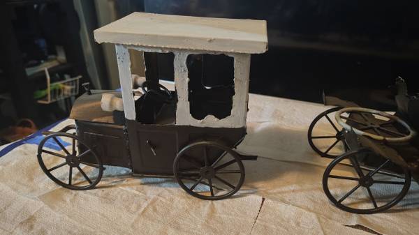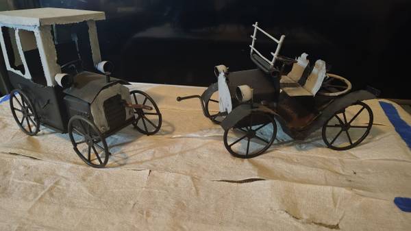 I purchased these tin made cars in California about 40 years ago. Model A And a model T they have a wind-up music box built-in they are a Fun idem to have on your shelf 3.5"by 7" Long.