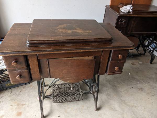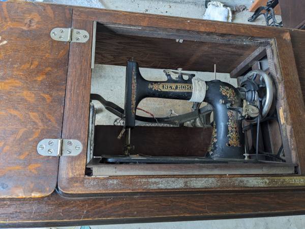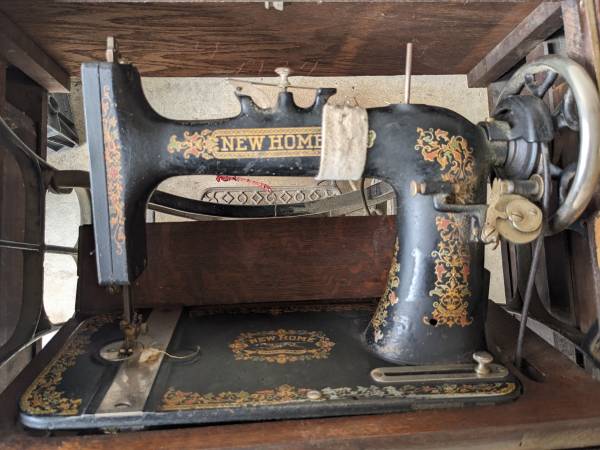New home vintage sewing machine. Unsure of the year. It works ..however the wire to hold the board that supports machine broke..easy fix for someone who knows what they are doing. It has some original accessories in small box posted in one of the pictures... 100 OBO .. you pick up only..