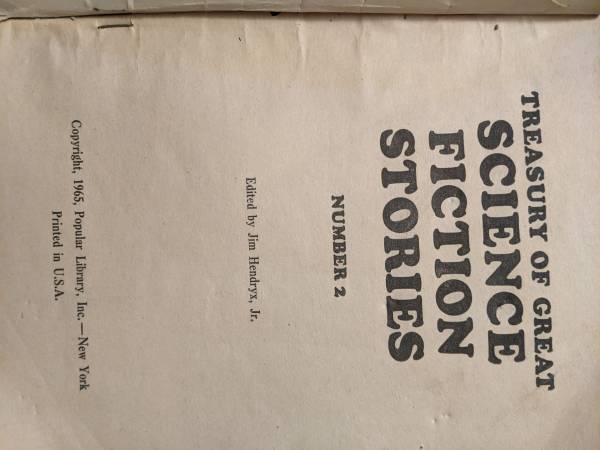 My grampa wants me to sell his books because his not going to be reading them again. (Treasury of great science fiction stories #2). I would say it is an ok condition since it's from 1965. Has a small tear on the spine of the book. I would like cash only.