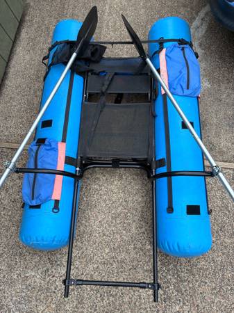 Super cat pontoon craft. Aluminum frame with raft grade/pontoons/2 tackle bags/seat bag/2 Oars/backpack straps/pump adapter/stripping apron.