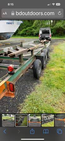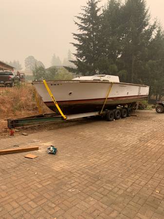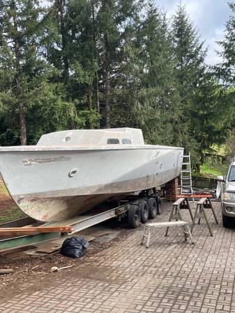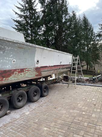 This is a former Navy vessel 36’ LCPL. These boats are built to a high standard and have a very thick solid bottom. No wood used in the construction. It originally had a Detroit 6-71 and foam filled sides and pockets in the hull. The foam in these boats get’s wet over decades of use and adds weight, this boat has been stripped completely of all wiring, motor, foam and work has been to clean and restore this to make a 36’ full walk around fishing boat. I began making a cabin, roof is made, walls are made just needs final assembly. I have a new diamond Sea Glaze windshield. It comes on this 4 axel heavy adjustable trailer it’s not much to look at but it stout and makes the project doable. I bought the trailer from a guy up in Westport who used it to haul a 36’ Navy boat he bought at auction. A few photos attached are other completed projects that I had gathered.