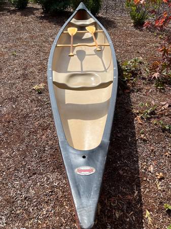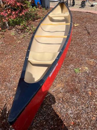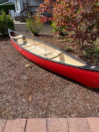 Red Old Town Discovery 169 Canoe. Length is 16’ 9”. Includes paddles. Material is CrossLink3.