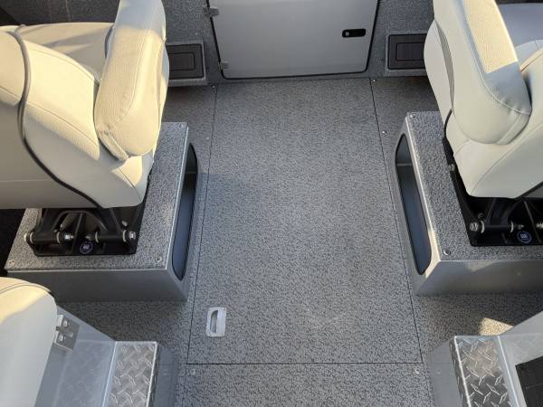 2 Fishmaster XL seats on Silver painted aluminum storage boxes with pedestals