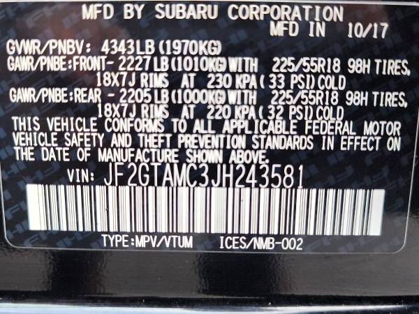 Power Door Locks, Air Conditioning, CD/MP3 (Single Disc), Dual Air Bags, Power Steering, Heated Seats, Roof Rack, Cruise Control, AWD, Side Air Bags, Daytime Running Lights, Power Seat, AM/FM Stereo, Tilt & Telescoping Wheel, F&R Head Curtain Air Bags, Anti-Theft System, Rear Spoiler, Hill Holder, Traction Control, Keyless Entry, XM Satellite, Fog Lights, Vehicle Dynamic Control, Power Windows, Alloy Wheels, Automatic, CVT w/Manual Mode, ABS (4-Wheel), 4-Cyl, PZEV, 2.5 Liter, Bluetooth Wireless
