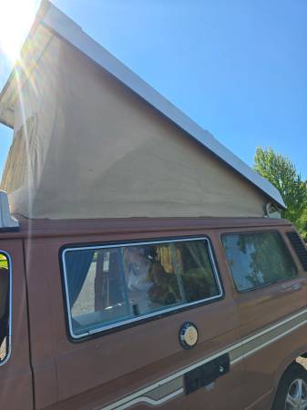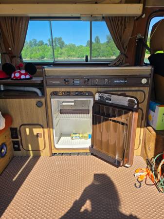 We are devastated to have to sell our Archie. But while we're devastated to sell, we're excited about the reason! We are expanding our human family! So we need to sell our beloved Archie. He's been all over the West. California, Oregon, Nevada, Utah. He's been to Zion! And he runs like a champ. Regular tune ups and maintenance. Currently being serviced by German Classics Workshop in Salem, Or. Current tags. All Westfalia camping interior present minus the front, small table. Stove works. Refrigerator works on shore power, never tried it with propane. The top has no tears but the zipper that holds the window closed is broken. The flap rests over the frame and still provides plenty of privacy while also allowing for circulation.