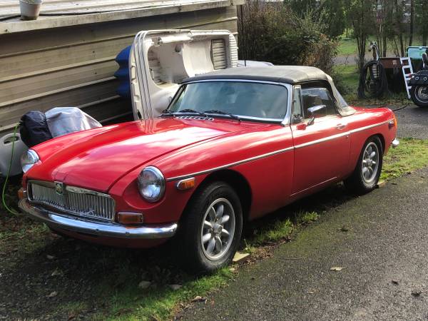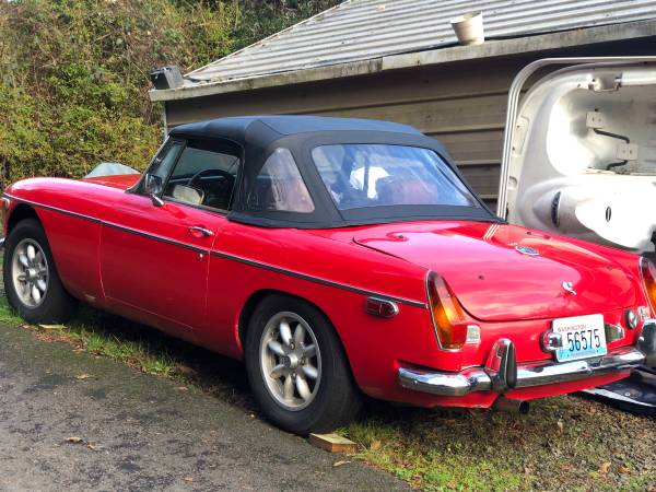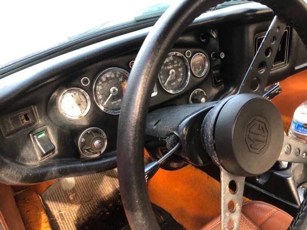 1974 Mgb, last year for chrome bumpers. 20 ft paint job, minilite wheels, straight body, nice driver or work to your hearts desire. Have dirty hardtop bought used, wire wheels & axle apparently needed to install. Soft top good. Starts right up and drives straight. Small header leak, uses oil but has good oil pressure.