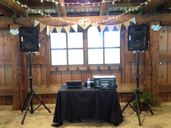 Rig: Tech stuff - Our standard setup includes two Main 12” passive commercial PA speakers on stands (good volume for up to 50 indoor guests or roughly 30 outdoors). We can scale to meet any size; see below. We run two devices of legal, licensed, and radio-edited music from all eras and styles. The music set is customized exclusively to you and your event. In addition, we also include a wireless handheld microphone that can be shared for toasts, thank you’s, etc.