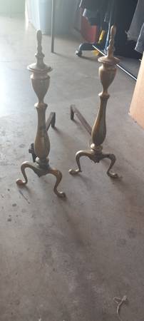 Brass andirons or otherise known as fireplace dogs Very nice ser, they need polished, been in storage. Cash only u haul