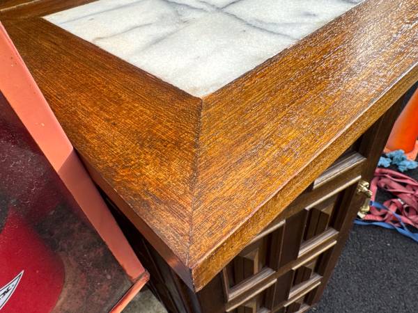 Authentic mid-century modern bar cabinet featuring real marble inlaid tops — a true vintage find from the 1960s–70s, fully cleaned, oiled, and restored to showcase its natural beauty.