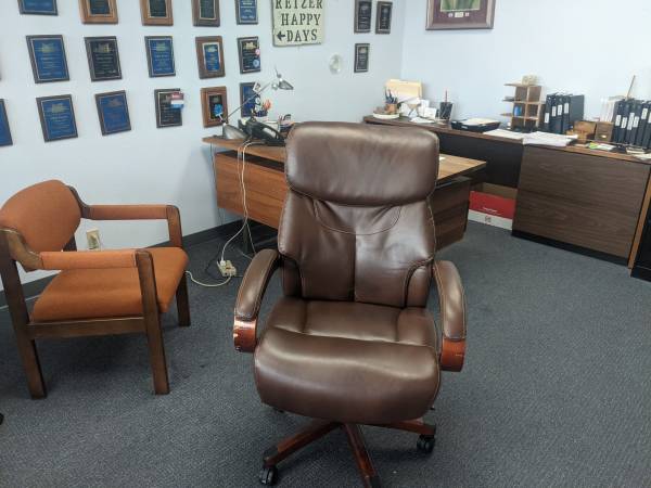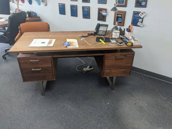 Keane 65" Weathered Natural wood desk with outlets. Executive chair Available now. Cash only.