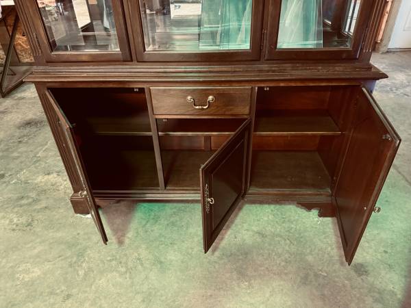 Ethan Allen China Cabinet makes a beautiful Display Case. It is in two sections for ease in moving. The china cabinet is lighted with six glass shelves behind three glass doors. The bottom buffet has three wood doors and a silverware drawer. The crown molding on the top of the china cabinet measures 56" wide. The cabinet is 52" wide and 14" deep. The buffet measures 15 1/2" deep and 16 1/2" deep at the trim. It is 55" wide. The total unit is 78" high. This is a timeless piece to display your keepsakes.