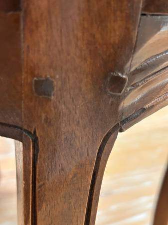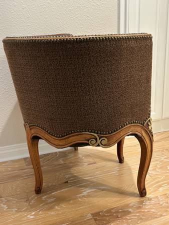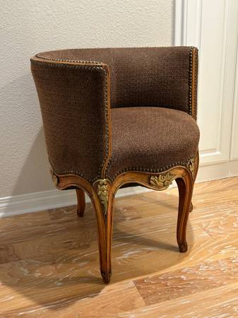 The fabric is in excellent condition; the solid walnut (wood) is beautifully carved and in excellent condition; the upholstery tacks are all there and in excellent condition; it has inner-spring construction for comfortable seating for men or women. It is very sturdy.