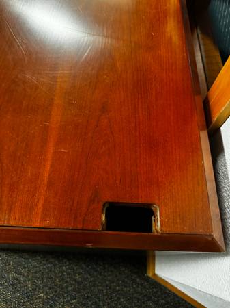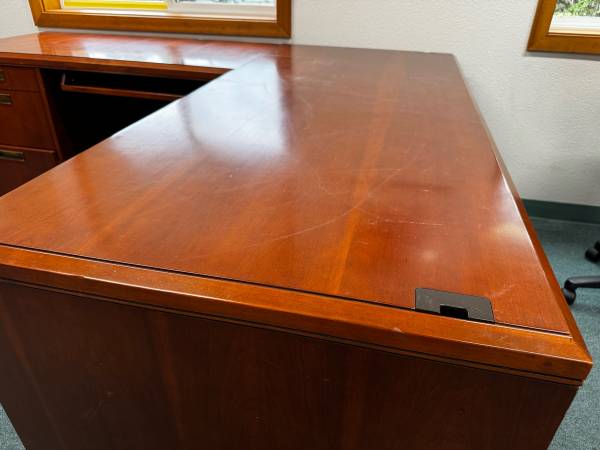 This beautiful executive desk is configured in an L shape. Includes two sets of filing drawers and a slide out keyboard. Also has cutouts for cords to pass through the desktop. Main desk measures...