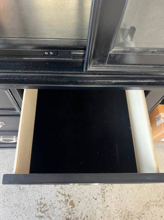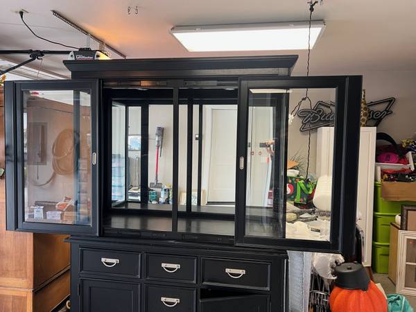 A beautifully lit dining room with the black china hutch styled with glassware and plants. Meet our stunning black china hutch — where classic design meets modern sophistication. Perfect for showcasing your dishes, glassware, or collectibles. Includes two glass shelves.