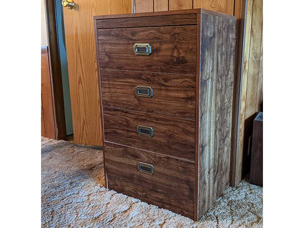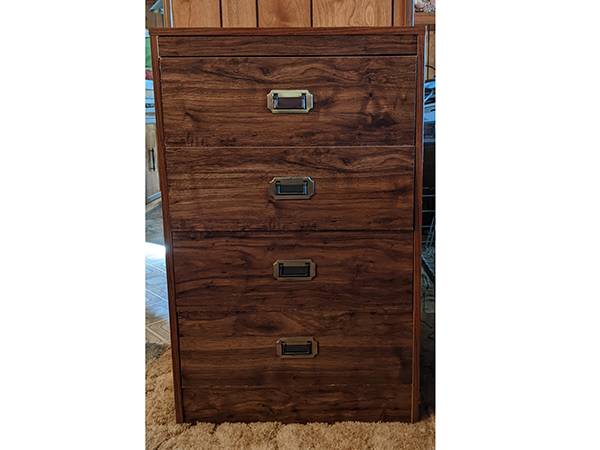 This chest of drawers provides great utility. The drawers are roomy and glide smoothly. Press-board with wood laminate and recessed handles. The wood-like exterior is in good shape.