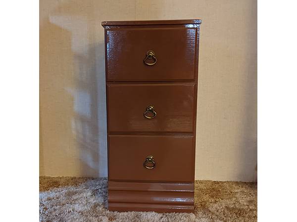 Plain wood nightstand, painted brown. 3 drawers and brass pulls. Good condition.