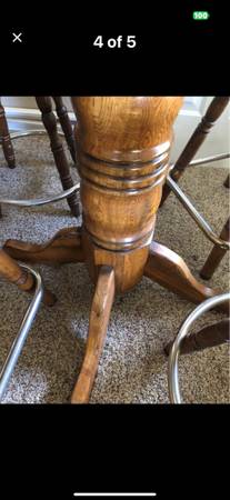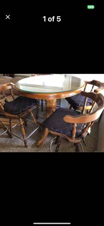 Oak pedestal round table w/custom bevels glass top and 5 barstool chairs.