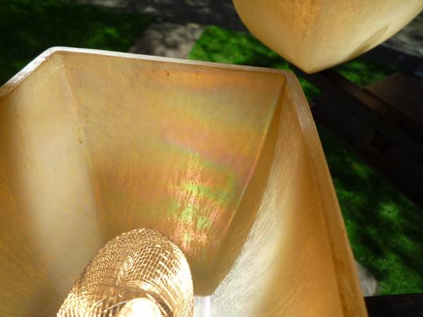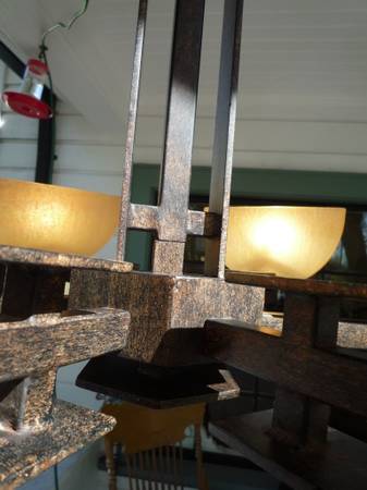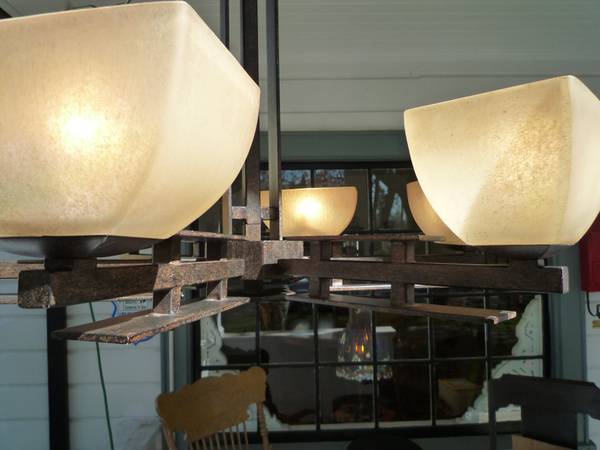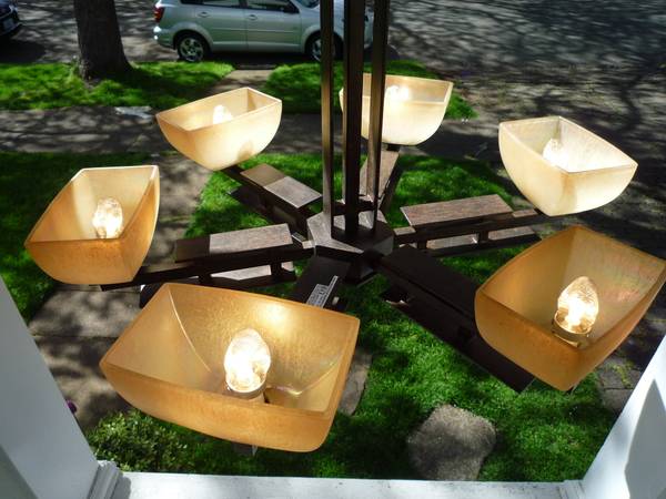 The fixture weighs 23 pounds without the 6 shades. It is made of iron. The total span is 29" and the height from the bottom to the top large circle is 25". There is an additional 6" chain and the electric and neutral wire goes 26" past the end of the chain. Each irredescent art glass shade is in perfect condition and is 7.25"L x 4.5"W x 3.5"H. The shades fit over the wire caged E11 Halogen JD mini bulbs and there is a horseshoe shaped silver clip that goes under a screw and fixes each shade in place. There are small places where the paint has chipped off and on the bottom part of the hexagon shape in the middle of the fixture the paint has been rubbed off. This piece would look best in a large room.