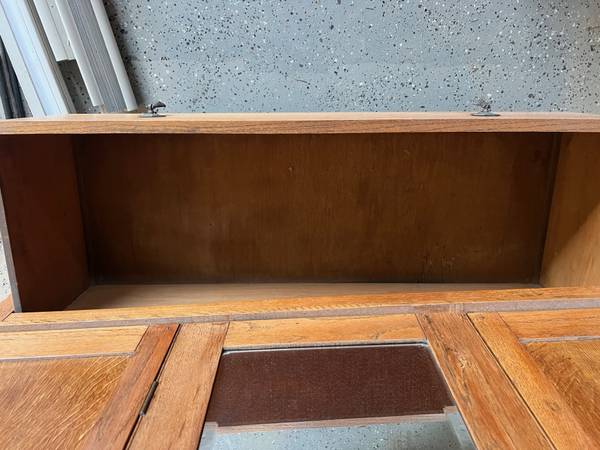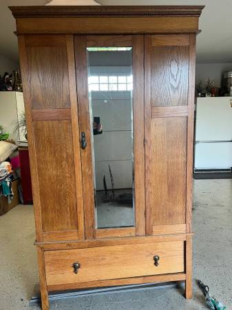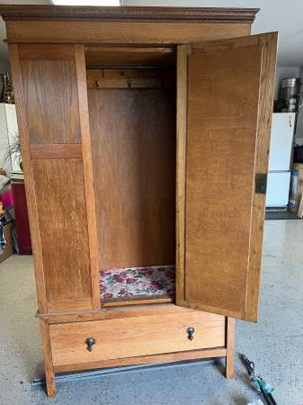 Discover the charm of our antique armoire cabinet — crafted in a warm natural stain that highlights its rich wood grain. Featuring a spacious wardrobe closet and a deep base drawer for added storage. There is an issue with the left side of the drawer.