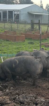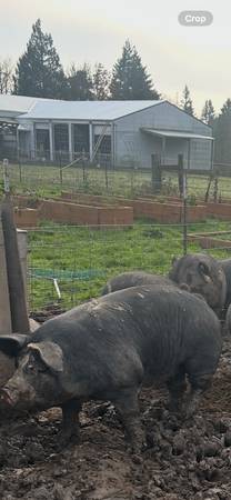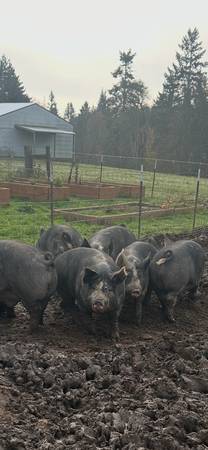 These pigs were purchased from a family farm in Canby and raised here on good local grain and fruit and veg scraps from our gardens. These are the pigs we raise for our families freezers. We currently have one Berkshire pig left available for our butcher date of November 21st. They are $5.20/lb hanging weight. They will be going to Sharps custom sitting in Hubbard to be processed. Please reach out to me with any questions. Call or text (but I prefer text because of my kids) show contact info
