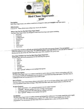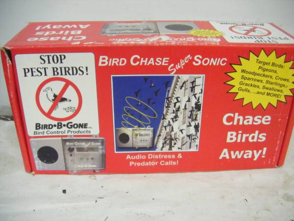 Bird B Gone Bird Chase Super Sonic electronic bird repeller; used only a couple of weeks... $70 ... Pre-recorded distress/predator calls scare birds away from treated areas Species specific; can be...