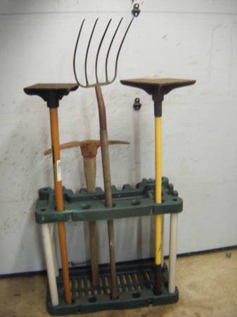 #1: D handle shovel, 39” long… $15 … #2: Shovel, True Temper Contractor Series… $15 … #3: Pick… $15 … #4: Tool rack, 26” high X29” X15”..;. $20