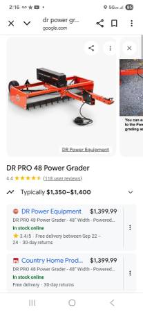 DR 48 inch pull behind power grader. Has flat free tires. Is missing height adjustment controller but can be replaced or reconfigured to work without it. Overall it is in good condition and does not appear to have been used alot. If interested please leave your number and I will call you as soon as I can. Thanks!