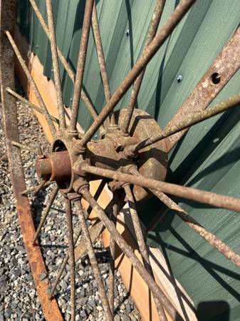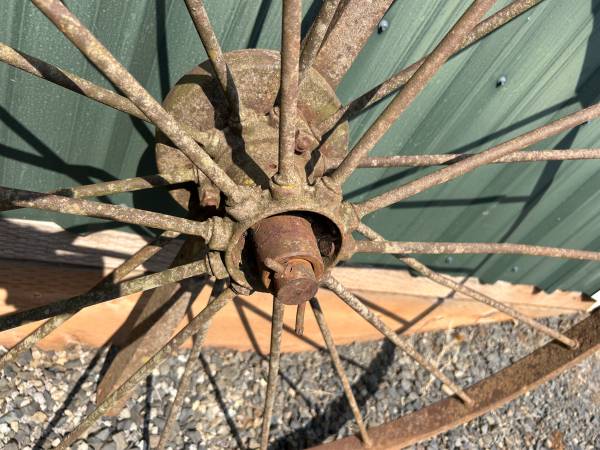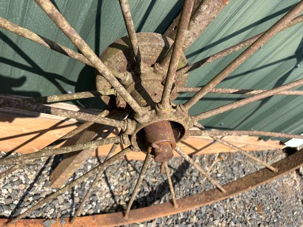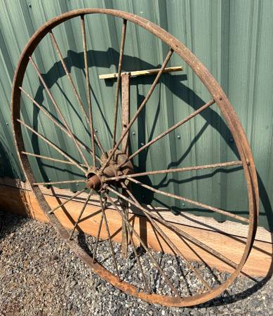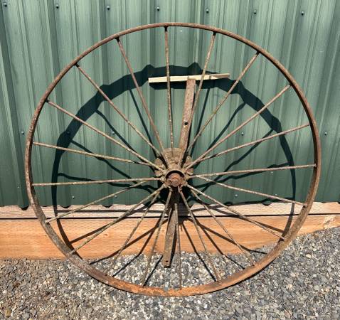 See pics This is a huge very old steel wheel with a working hub. It measures 54 inches high and 54 inches wide. Text is best 503-559-67 oh six 200 or best cash offer