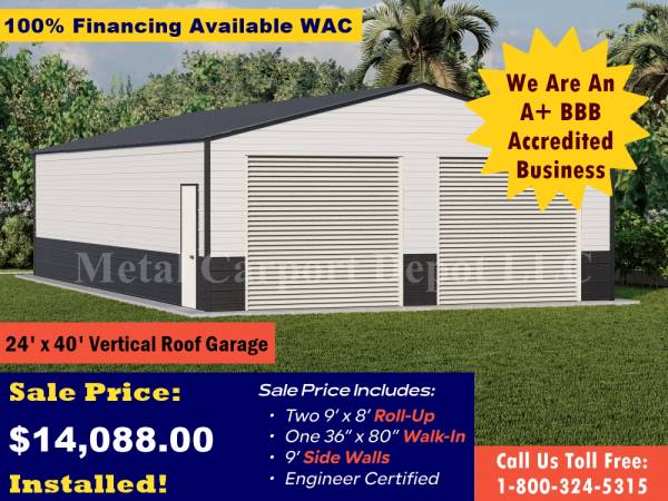 Safeguard And Protect Your Valuable Vehicles And Equipment From The Elements For Years To Come with this 24' x 31' Boxed Eave Style Metal Building with the 29 Gauge Vertical Metal Roof. It is on sale now for just $12,088.00 After Discount, Including Delivery and Installation on your Existing Concrete Slab or Level Ground.