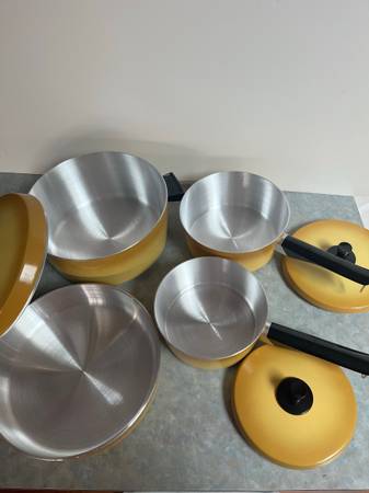 NEW VINTAGE HARVEST GOLD KITCHEN DELIGHT MADE IN USA 4 POTS & PAN 7 PIECES NO BOX