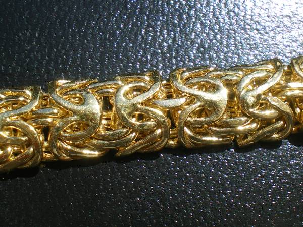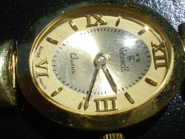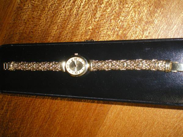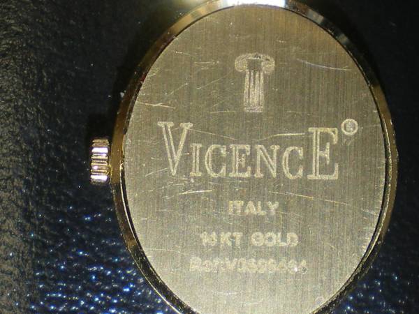 This 14k gold vintage Italian watch has spent many years in a safe and includes a brand new battery. It is by the Italian maker Vicence with a Swiss movement. The standout feature of this watch is the brilliant gold Byzantine chain bracelet band with a very secure closure. The crystal face features a dial with Roman numerals. This watch weighs about 22 grams and is a little bit longer than 7 inches. This is a stunning timepiece that doubles as an equally stunning piece of jewelry. Price is $1800--cash only.