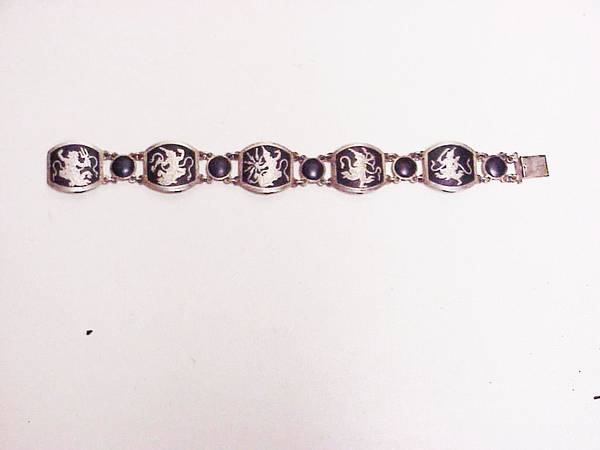 Sterling Bracelet Sena Siam Inlaid Dancers 925 Silver 27.1g 7-1/4” long not counting the latch The 5 dancers are 13/16” tall, 13/16” wide, the round things between them are 3/8”.