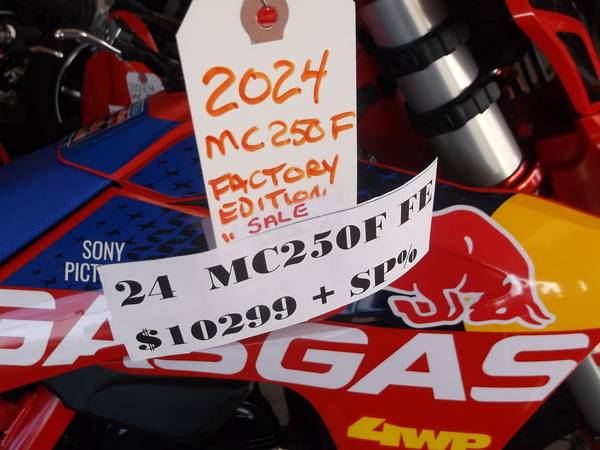 New 2024 Gas Gas MC250F Factory Edition MSRP $11349 - Sale price $9995 NO EXTRA FEES. Sale prices include all current sales promos, rebates and Bill's IN HOUSE discounts. Financing available to...
