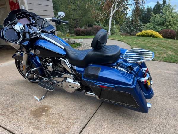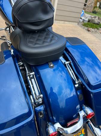 Saddlemen main seat, Saddlemen passenger back rest, drivers adjustable and removable backrest, Rockford Fosgate speaker system & Amp, all high velocity bulbs on the bike, lower foot pegs, H.D. cover, crome rear removable rack with quick disconnect, custom one of kind Tour Pack custom painted and striped to match the bike and they do not sell these to match this bike. Get it before it's gone.