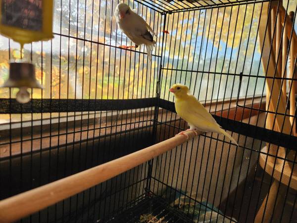 Female is solid yellow and male is mostly white with some brown. She lays eggs if theres a nest in the bird cage put they dont hatch because the male is too old, but he does sing when hes in his separate cage.