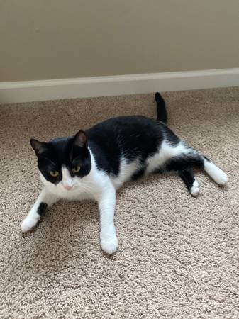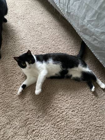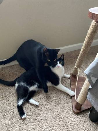 One black male and one black & white female cat need a good home. Brother and sister. They have only been indoor cats. Both litter box trained. Born in May 2024 sometime. They were rescued. Both were fixed November 2024. Unfortunately needing to rehome due to our dog not adjusting with the cats. Very friendly cats. The black one does not like dogs.