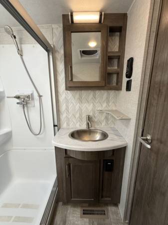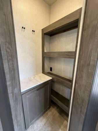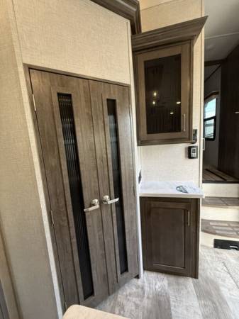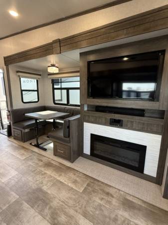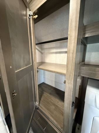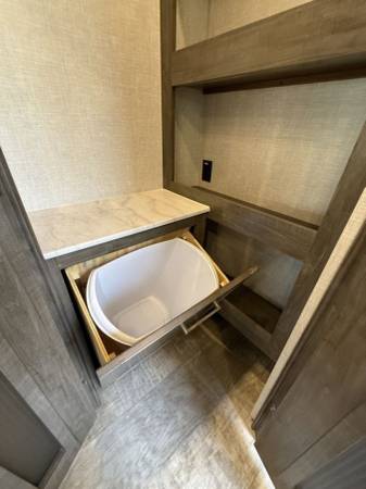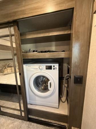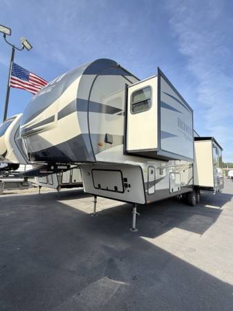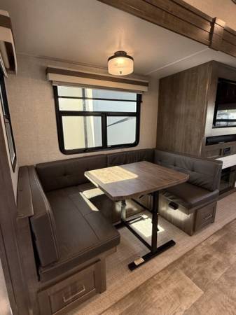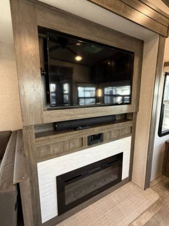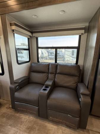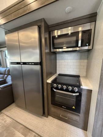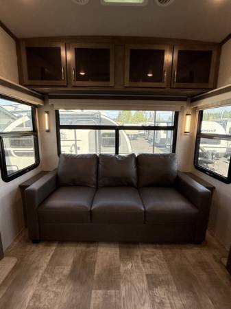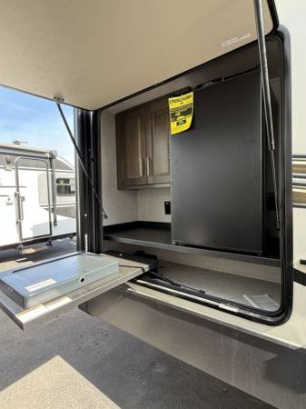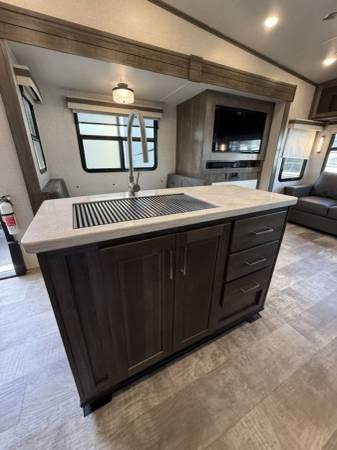 This island kitchen fifth wheel with an enormous rear window gives you a great vista of the back of your camper. The outside camp kitchen features a fridge and stove top for those who like to cook in nature. With a theater seat and hide-a-bed sofa you can have guests spend the night and enjoy comfortable seating. The large dinette is perfect for sharing a meal. The corner walk-in pantry stores everything that you would ever need to make that perfect meal.