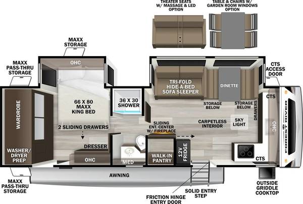 MAXX INSULATION PACKAGE, DYNAMIC TECHNOLOGY PACKAGE, GARDEN ROOM (TABLE AND CHAIRS) 2ND 13.5 BEDROOM AC, THEATER SEATING IPO SLEEPER SOFA