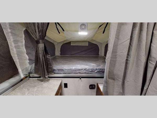 With any Forest River Flagstaff High Wall folding pop-up, the tent camper construction includes a fiberglass vacuum bonded radius roof with no center seam, five-piece Vinylon supreme tenting, EZ crank down stabilizer jacks with sand pads and full perimeter aluminum bed frames to mention a few features all on a powder coated tubular steel frame. More standard features include ProRac roof mounted cross bars with optional bike and kayak carrier attachments, solar prep on the frame, an outside shower to clean off the dirt from your shoes and toys, and a MORryde step. The indoors offers comfortable sleeping arrangements on the heated mattress on the tent bunk ends, raised panel cabinet doors, two bed end lights with a fan, privacy curtains with valances, and upgraded appliances. Make your lightweight camper selection today and start camping large!
